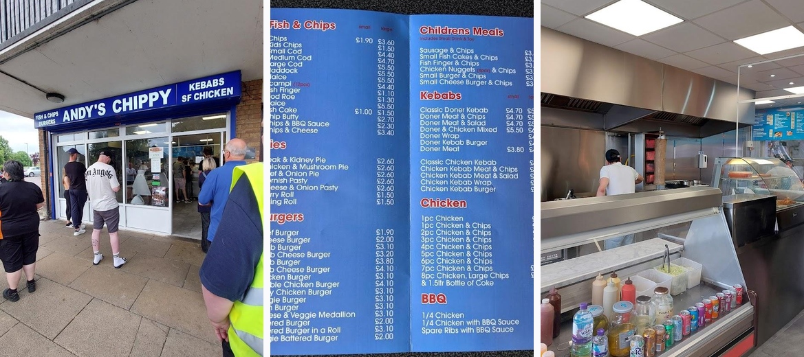 Andy's Chippy offers a price range from £1 to £10, making it an affordable spot for fish and chips and fast food.